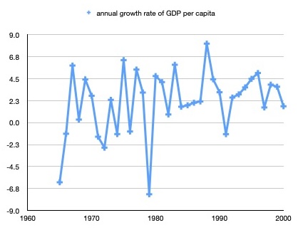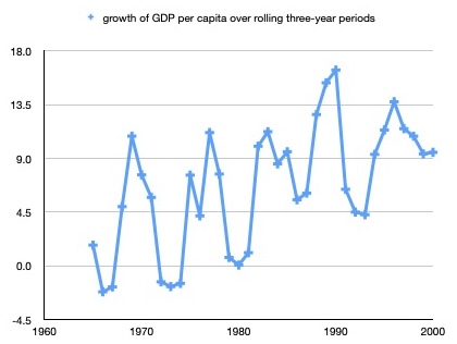 - Define y(t) as GDP per capita in year t. In the first figure, the growth rate in year t is the percentage by which y(t) exceeds y(t-1). In the second figure, it is the percentage by which y(t) exceeds y(t-3). ↩