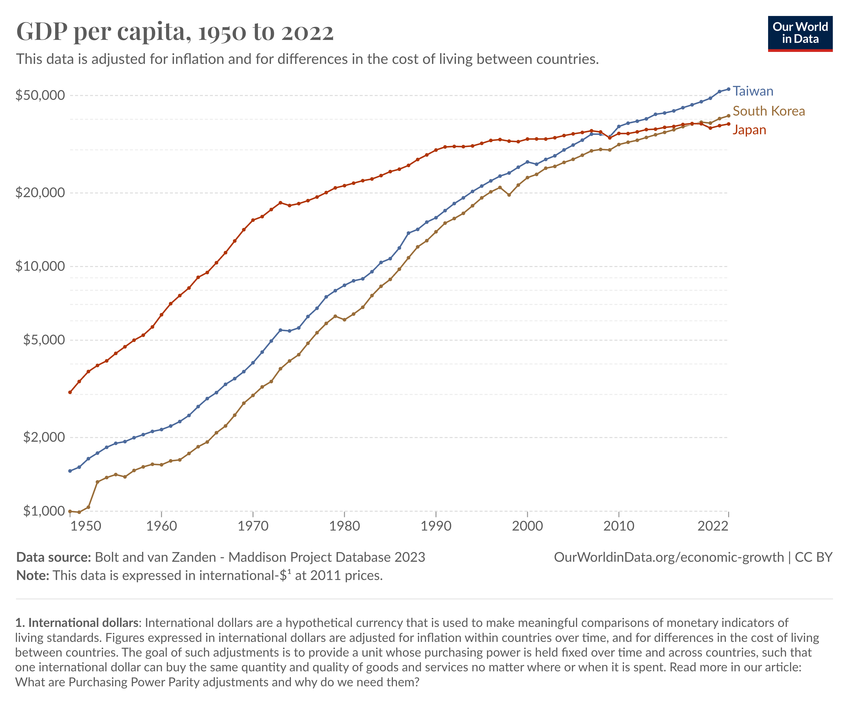 The only precise way to measure the benefits of Taiwan’s industrial policy is to compare two histories of Taiwan: one with the policy in place, and one without it. But, obviously, we only know one of these histories — the one that actually happened. What we do know, though, is that factors external to Taiwan — factors that would have been in place in either history — were highly favourable to Taiwan’s economic growth. Trade expanded massively in the postwar period, allowing East Asia’s early industrializers — Japan, Korea, and Taiwan — to readily find foreign markets for their goods. As well, all three countries benefited from a brief period of “asymmetric trade”: less developed countries were given free access to the markets of the United States and some other western countries, even as they used tariffs and quotas to stifle imports into their own countries. This period lasted roughly three decades, from the end of World War II to the mid-1970s. Finally, all three countries benefited from the sale of goods to the American military during the Vietnam War. So Taiwan might have done quite well even without its industrial policy.