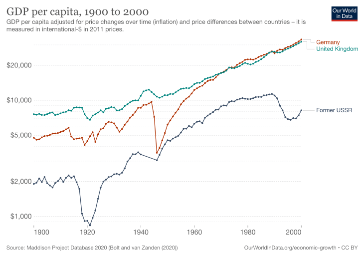 How successful was the Stalinist economy? The graph below shows the per capita GDP of the Soviet Union, or its territorial equivalent. The graph is log-linear, so rates of growth are proportional to slopes.25 World War I and the revolution sharply reduced per capita output. It was not until 1929 that the Soviet Union’s per capita output equalled the peak per capita output of tsarist Russia. There was slow growth in the first few years of Stalin’s policies, rapid growth during the period 1933-1939, and then slow growth again leading into the war. The Soviet Union’s growth during its best years was comparable to that of Germany, but both were growing faster than the United Kingdom. The war was immensely damaging to both the Soviet Union and Germany, and both countries experienced rapid growth during their post-war reconstructions.