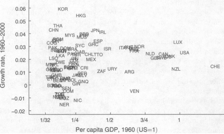 The top of the triangle is formed by a group of countries which were relatively poor in 1960, but which had recently adopted inclusive institutions or were moving toward them. This group includes South Korea,12 Hong Kong,13 Ireland,14 Israel,15 Spain16 and a few others. Each of these countries grew faster than the United States, not just for a year or two but for forty years, and the poorer they were in 1960, the faster they grew. They began with old technologies, and grew by replacing those technologies with modern ones. They were able to grow very quickly because they were implementing technologies that had been developed elsewhere. The technological leaders, by contrast, had to invent new technologies before they could implement them, and invention is a difficult and expensive proposition.