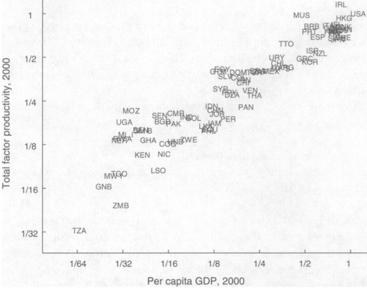 Olson, writing in 1996, concluded that much of the variation in per capita incomes is explained by the second possibility. The evidence has become stronger in the ensuing decades. Consider, for example, the figure below.3 Per capita output is measured along the horizontal axis. Total factor productivity (TFP), a measure of the efficiency with which a country utilizes its productive resources, is measured along the vertical axis. The data point for each country is indicated by its three-letter country code. The data have been normalized by dividing each country’s per capita output and TFP by the corresponding American value. The data point for Tanzania, for example, is roughly (1/64, 1/32). It indicates that the average Tanzanian consumes 1/64 as much goods and services as the average American, and that Tanzanian resource usage is 1/32 as efficient as American resource usage. The figure shows a very strong positive correlation between TFP and per capita output: the countries that are poorer are also the countries that use their productive resources less efficiently.4