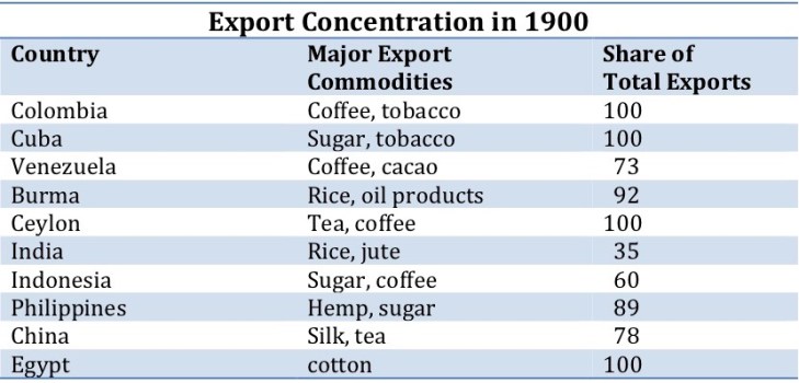 The poor periphery reacted to the opportunity to trade with the industrial core by becoming highly specialized. Here, once again, is a table showing how specialized they became:10