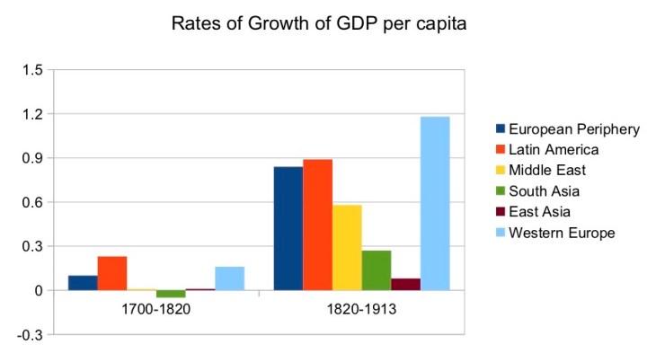 The industrialization precipitated by the First and Second Industrial Revolutions explains the increase in Western Europe’s growth rate. There was little industrialization in the other regions — there was even de-industrialization — so the same factor does not explain the increase in their growth rates. Their growth rates were drawn upwards by their strengthening trade ties with the industrial economies.