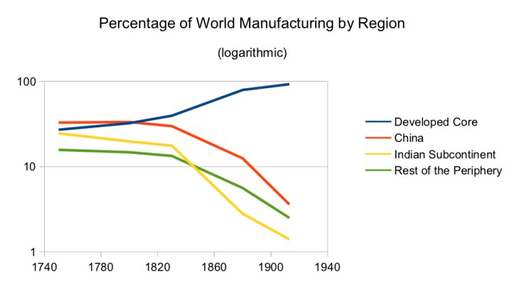 Of course, the nature of manufacturing was changing at the same time as its location was shifting. The manufacturing lost by the periphery was labour-intensive cottage industry. It was replaced in the West by increasingly mechanized production, and later in the century, by factory production.