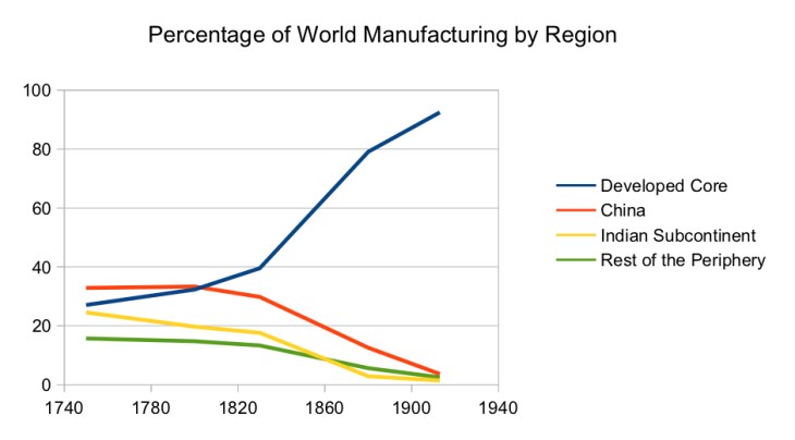 The figure below divides the world into four regions: the developed core, China, the Indian subcontinent, and the rest. Each data point shows a region’s percentage of world manufacturing output at one of five dates: 1750, 1800, 1830, 1880 and 1913.11 In 1750 the regions had roughly equal shares of world manufacturing. The core’s share of manufacturing rose somewhat during the First Industrial Revolution, and the shares of the other regions declined, but the changes are not shocking. The same cannot be said of the period 1830-1913, when the world’s economies integrated. The core’s share rose steadily until the core held a virtual hegemony over manufacturing. Manufacturing in the other regions all but disappeared.