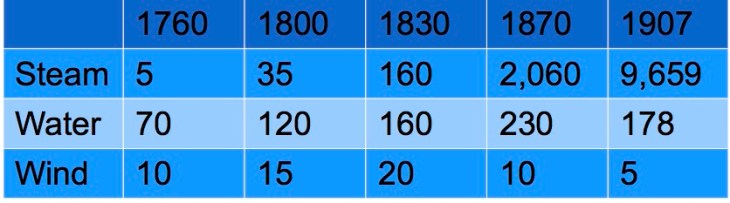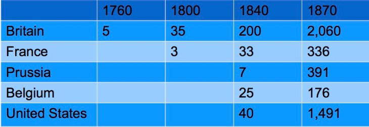 Britain was the early adopter. The use of the steam engine lagged in other countries because their wages were lower and their fuel costs were higher. The steam engine did not become profitable for them until it was both cheaper and more fuel efficient. The following table shows installed steam power and illustrates Britain’s lead.19