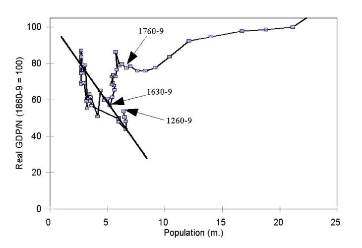 The figure below is Gregory Clark’s plot of England’s population and per capita income across time.1 Malthusian economics predicts a negative relationship between these variables, and that negative relationship is fairly evident until 1630. Then, from 1630 until the beginning of the Industrial Revolution in 1760, per capita income grew steadily, even though the population remained stable.
