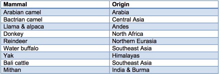 Likewise, almost all of the locally important mammals are of Eurasian origin. The only exceptions are the Americas’ llama and alpaca.