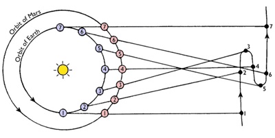 As well as “saving” the assumption of uniform motion, these postulates simplified astronomy in several ways. First, a rotating earth provided a single explanation for three phenomena that had previously been treated separately: the daily movement of the stars, the rising and setting of the sun, and the rising and setting of the moon. Second, Copernicus was able to identify a new empirical regularity: the closer a planet is to the sun, the faster it moves. Third, retrograde motion finally made sense. It was caused by the relative movements of the earth and another planet, as shown in the figure below.32